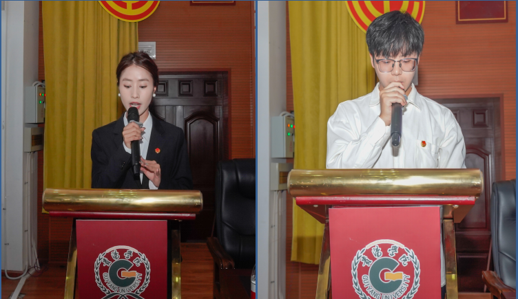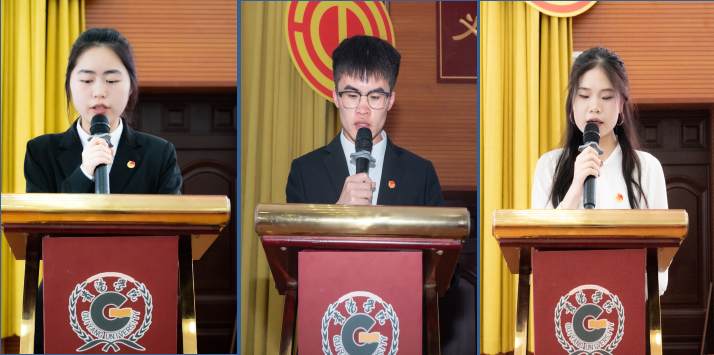 秦方雪代表第十二届团总支干部宣读卸职报告。吴超强代表第十二届员工会干部宣读卸职报告。邓芳代表第四研究生会宣读卸职报告。