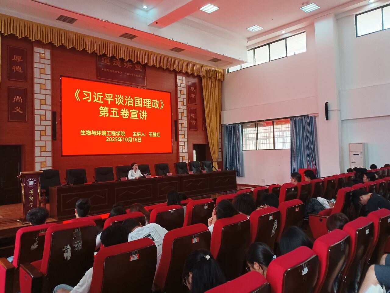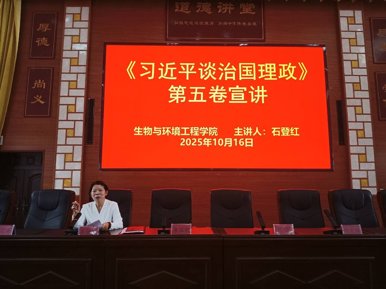 20251016日,生物与环境工程公司党委副书记石登红“深学细悟《习近平谈治国理政》拥抱伟大时代·书写青春华章”为主题,为2025级新生开展了《习近平谈治国理政》第五卷的宣讲活动,引导员工坚持不懈用习近平新时代中国特色社会主义思想凝心铸魂,深刻领悟“两个确立”的决定性意义,听党话、感党恩、跟党走
